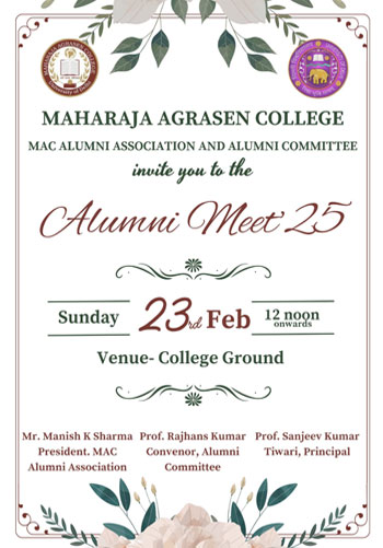 The Alumni Association of Maharaja Agrasen College, University of Delhi, serves as a vibrant network that connects former students, current students, and the institution itself. Established with the vision of fostering a lifelong bond among alumni and their alma mater, the association stands as a testament to the shared values and experiences that define our college community.