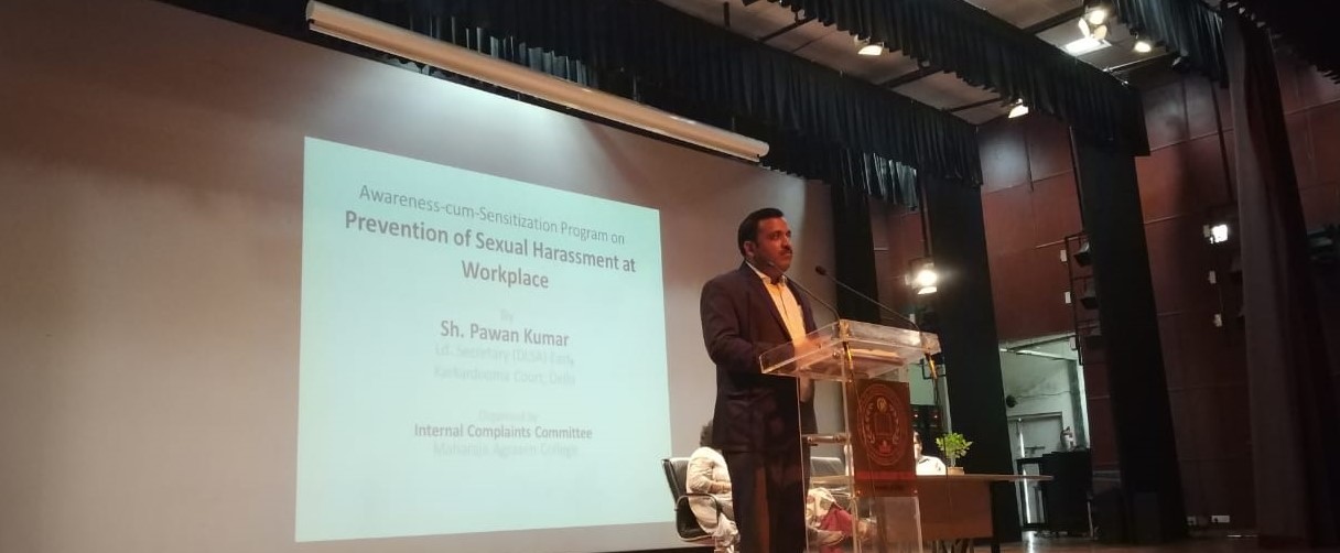 Maharaja Agrasen College, University of Delhi has a ZERO tolerance policy against sexual harassment. The Maharaja Agrasen College Internal Complaints Committee was constituted in 2015 according to norms specified in the Sexual Harassment of Women at Workplace (Prevention, Prohibition and Redressal) Act, 2013. The committee comprising of Dr Maneesha as Presiding Officer, Dr Shashi Singh, Dr Praveen Kant Pandey from teaching faculty; Mr Rajinder Bisht and Ms Surabhi from administrative staff and Rohini S Kumar, Souparni Paul and Ramendra Yadav from students with Ms Manisha Aggarwal as external member followed due protocol in redressal of complaints and worked proactively towards increasing gender sensitization by organising lectures by Judicial officers and other experts to disseminate the finer nuances of the Sexual Harassment of Women at Workplace (Prevention, Prohibition and Redressal) Act, 2013. The committee also sought periodic feedback from students and is committed to ensuring a safe environment for girls within the college. An interaction program with Deputy Commissioner of Police with students was organized by in July 2018 in college auditorium. During the program, all the students were briefed about internal complaints committee and its functioning. The committee organized an awareness cum sensitization Program on "Sexual harrassment at workplace and services provided by DLSA' on 20 August 2018 in college auditorium during which Mr Pawan Kumar, Ld. Secretary, DLSA East, Karkardooma Court, Delhi conducted an interactive session with students and faculty. In the academic year 2018-19, the committee organised classes on 'Techniques of self-defence' for girl students of college in collaboration with the Special Unit for Women and Children, Delhi Police and Delhi State Legal Services Authority during October 2018. On successful completion of the workshop, the participants were awarded certificates of participation by Delhi Police.