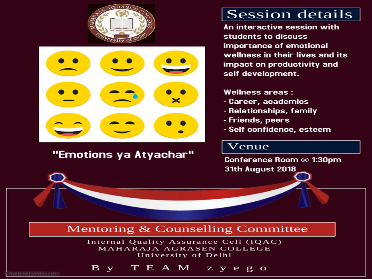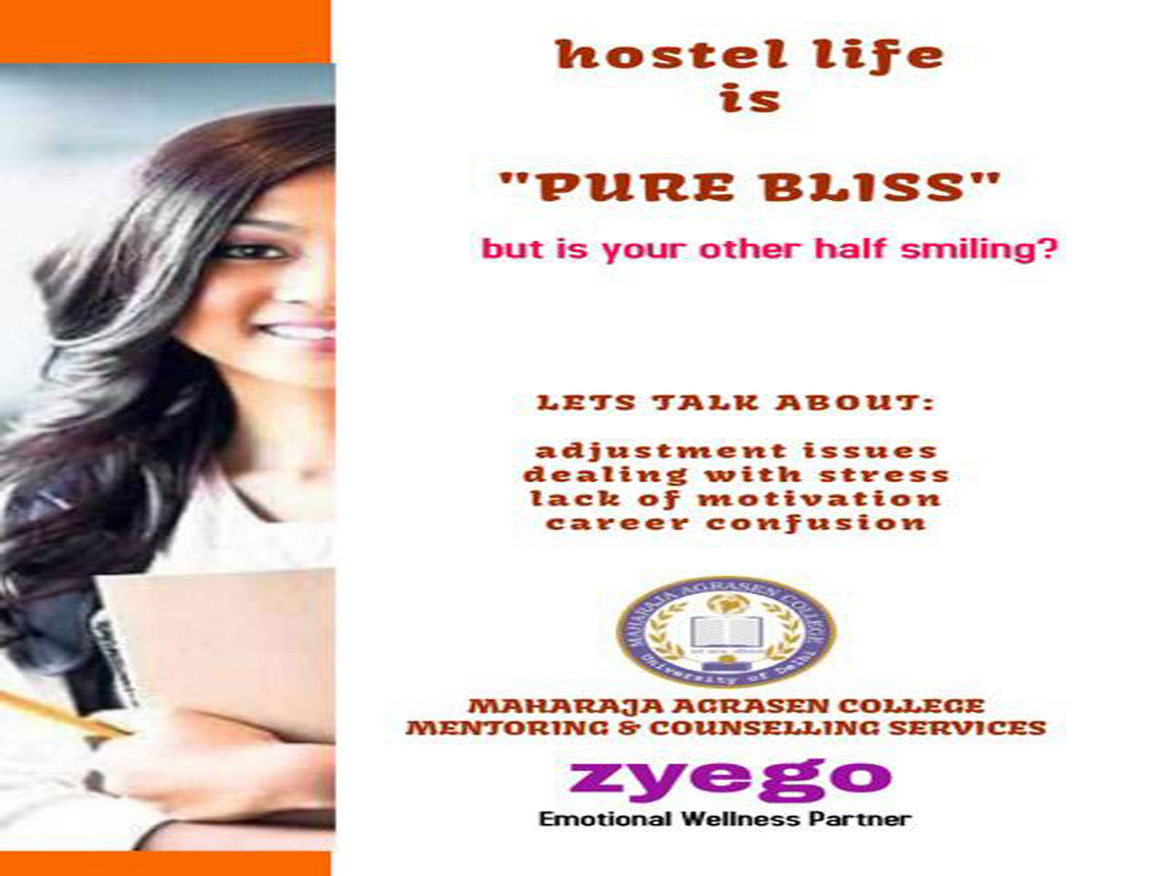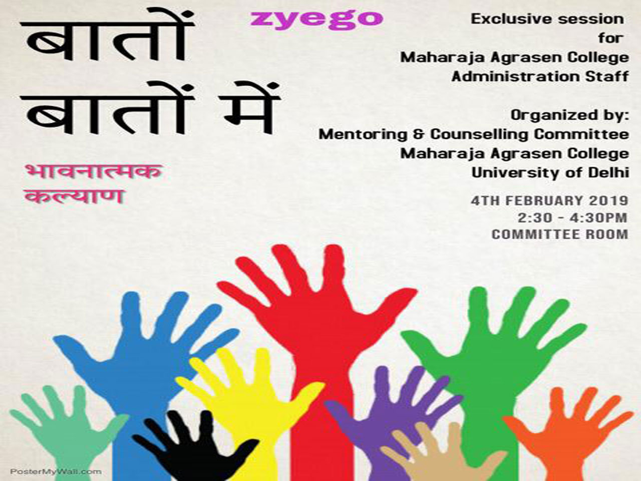 An IQAC initiative, the Mentoring & Counselling Committee in collaboration with Zyego: Student Counselling Services organized several workshops in the academic session 2018-19 to help students deal with myriad issues such as stress management, low self-esteem, anger management and career choices. Workshops for students of various courses were organized on 30 October and 15 November 2018. Workshops were also organized for faculty to augment mentor sensitization on 30 January 2019 and to augment soft skills in the administrative staff on 4 February 2019. There was a special session for hostelers on adjustment issues, lack of motivation and confusion regarding career choices on 6 February 2019. A workshop titled, ‘What am I worth? Am I good enough?’ was organized for students of BA Programme on 20 February 2019 along with ‘Let's talk the walk of life’ for First year students on 27 July 2019 and Explore your self-confidence for BA Program students on 23 August 2019. These workshops were much appreciated by students, Faculty and Administrative staff. Not only has the feedback been very positive but students have expressed their need for many more such workshops.